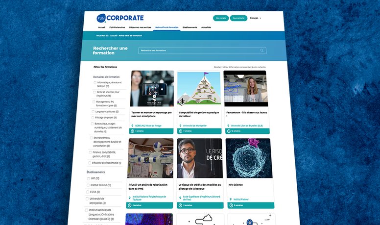 FUN-Partenaires propose sur sa plateforme FUN Corporate aux entreprises et aux administrations qui souhaitent former leurs salariés ou leurs agents 65 formations en ligne sur des sujets variés allant du management aux langages informatiques en passant par le droit, les sciences de gestion et la communication.